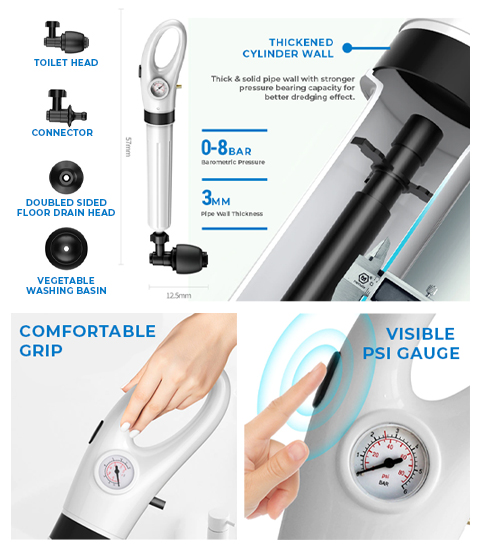 Based on the real-time barometer of this product, compressed air (up to 120PSI) can blow up the blockage in the pipe in seconds. Simply insert the pump into the device, press the air bag and insert the blocked drain and press the air button to clear the toilet or sink.