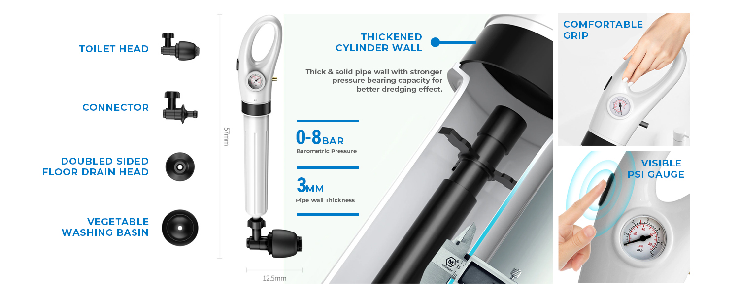 Equipped with 4 different removal heads that can be replaced with cleaning heads as needed for clogged pipes in the toilet, bathroom, kitchen floor drains and other scenarios. All kinds of blockages caused by various kinds of garbage are solved in seconds with the help of high pressure pneumatic. Suitable for toilet drains, bathroom sinks, kitchen sinks, floor drains. Ideal for all kinds of clogs - hair, cloth, tea, leaves, grease, oil dirties and so on.